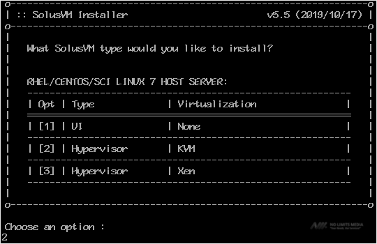 Step 2: For CentOS 7, It will show you the option to choose virtualization. Most people prefer KVM or Xen. Select your preferred virtualization by typing 2 or 3 and then press Enter. For KVM, we type 2 and then press Enter.
